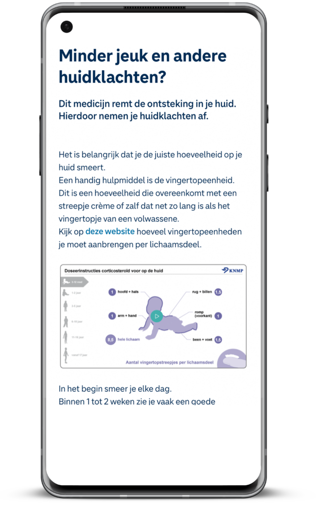 Medicijnzalf met corticosteroïd wordt bij veel huidaandoeningen gebruikt. Zoals bij eczeem, psoriasis of een andere huidaandoening waarbij de huid ontstoken is. De medicijnzalf remt de ontsteking. Het werkt alleen als je de juiste hoeveelheid op je huid smeert. Een handig hulpmiddel is de vingertopeenheid. In de app bekijk je direct hoeveel crème of zalf je per lichaamsdeel moet aanbrengen.