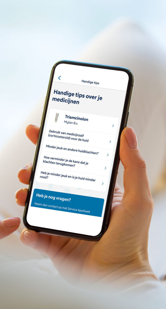 Zet je de meldingen aan in je telefoon van de Service Apotheek-app? Dan helpt de app je ook met tips om medicijnen die je voor het eerst krijgt, goed te gebruiken op de dagen in de behandeling dat dit logisch is. Bijvoorbeeld hoe het medicijn werkt en hoe snel je klachten verminderen. Je ontvangt dan tips over: